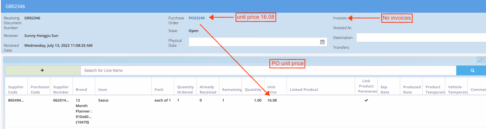 Above, the GR Note is not yet linked to an Invoice, therefore PO Unit Price is used.