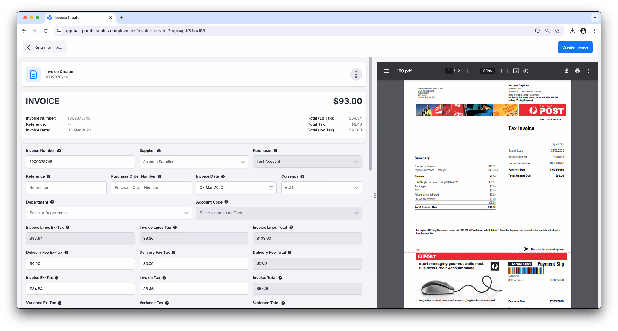 ..and the result must be checked by a PurchasePlus user at your Organisation, prior to it being officially created as a regular Invoice.