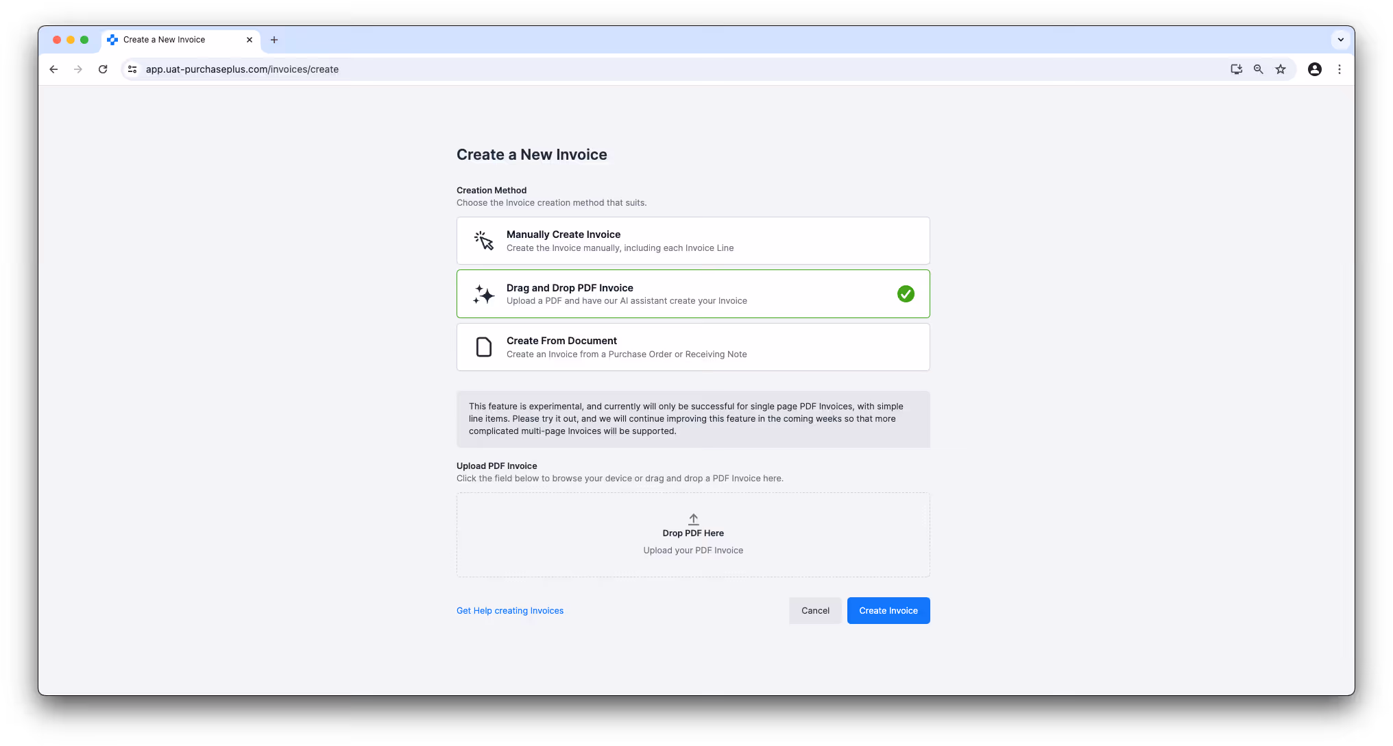 When creating an Invoice, we now offer a new Drag and Drop PDF option. This option uses our new AI Scanning feature; the supplied PDF will be scanned using our new AI technology and then created in PurchasePlus as an Invoice.
