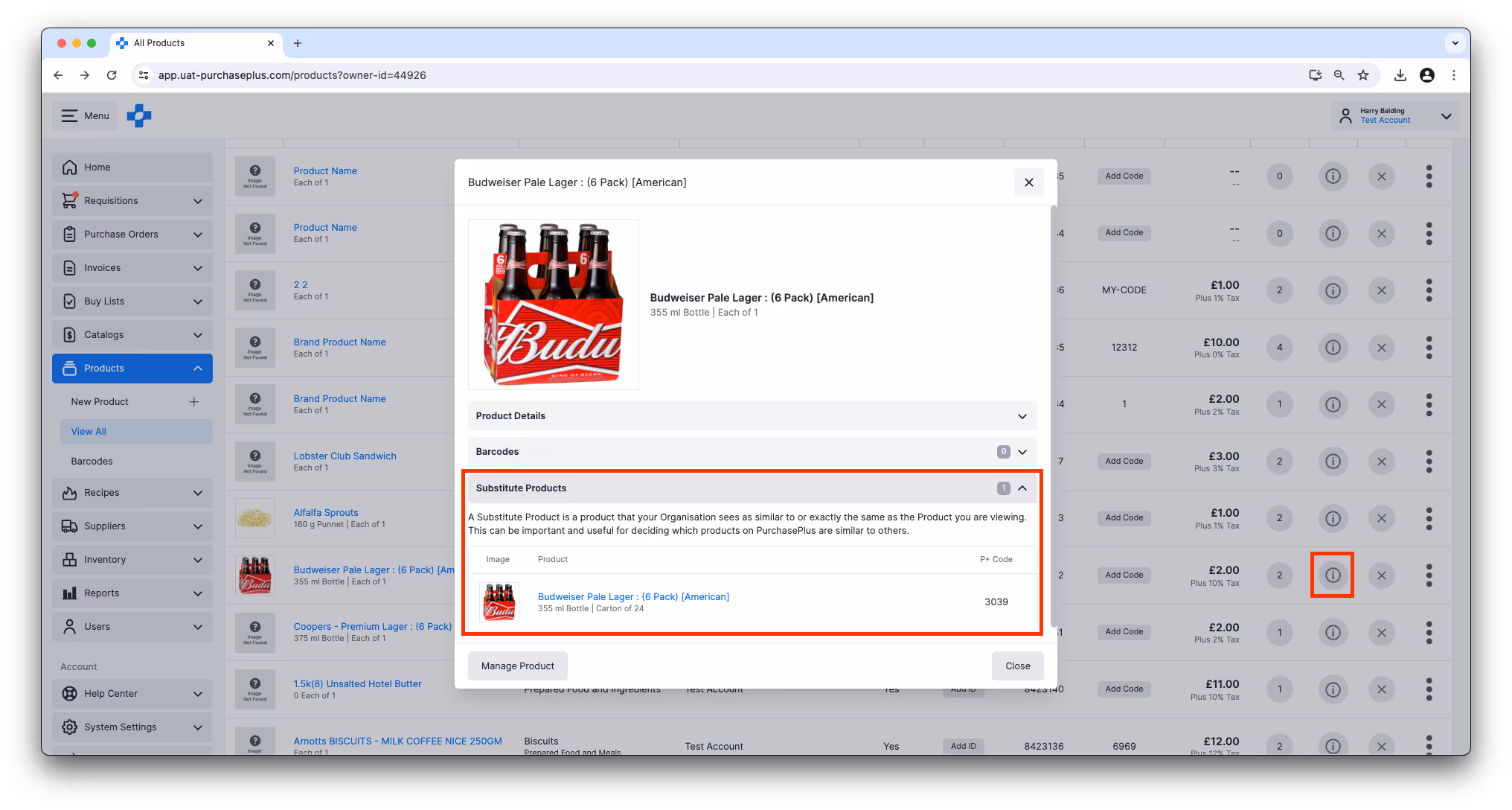 When viewing a Product’s Information Window, we now show Substitute Products for ease of Inventory and Recipe Management. Substitute Products are only applicable to the products in PurchasePlus that are owned and managed by your Organisation. A Substitute Product is one that your Organisation considers similar to or equivalent to the product you are viewing.
