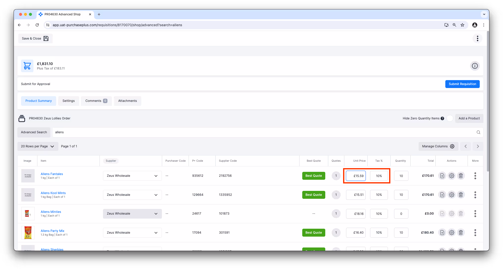 - Edit the Unit Price and Tax % on each Line in Advanced Shopping Mode, given that a Supplier has already been applied to the Line.