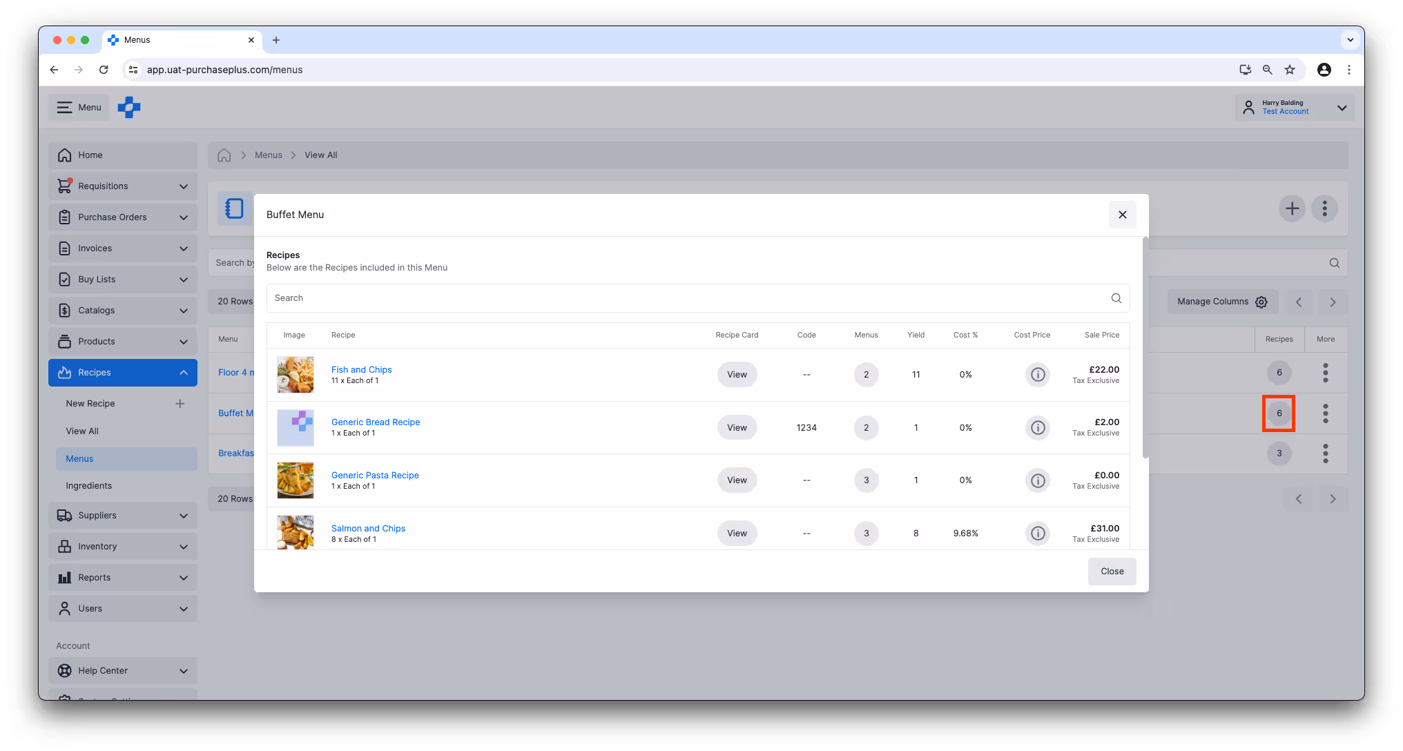 Above: Clicking the Recipes Count will show the user the Recipes in the Menu