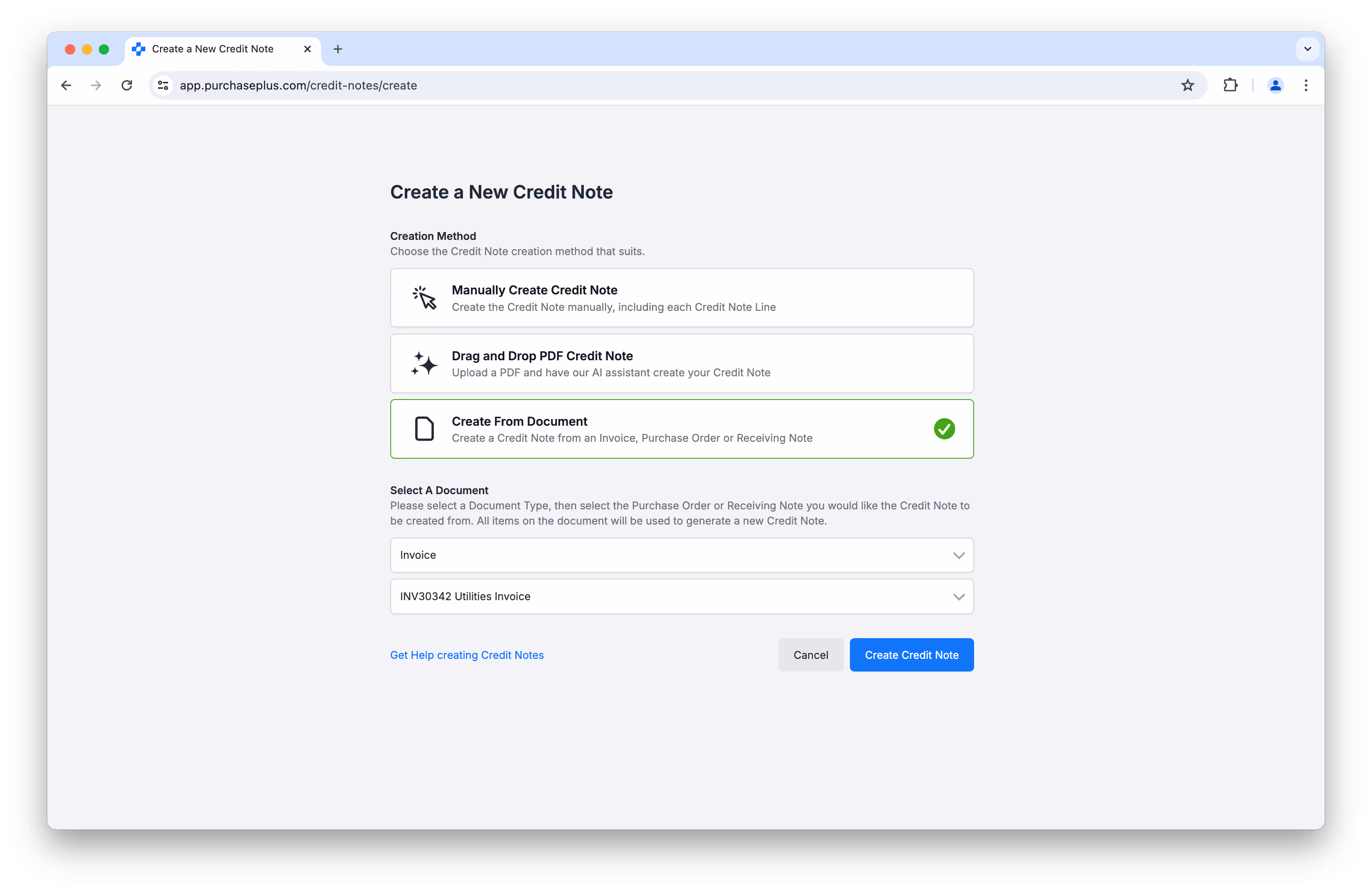 Above: Creating a Credit Note from an existing document is a powerful way to accelerate the creation of Credit Notes in PurchasePlus.