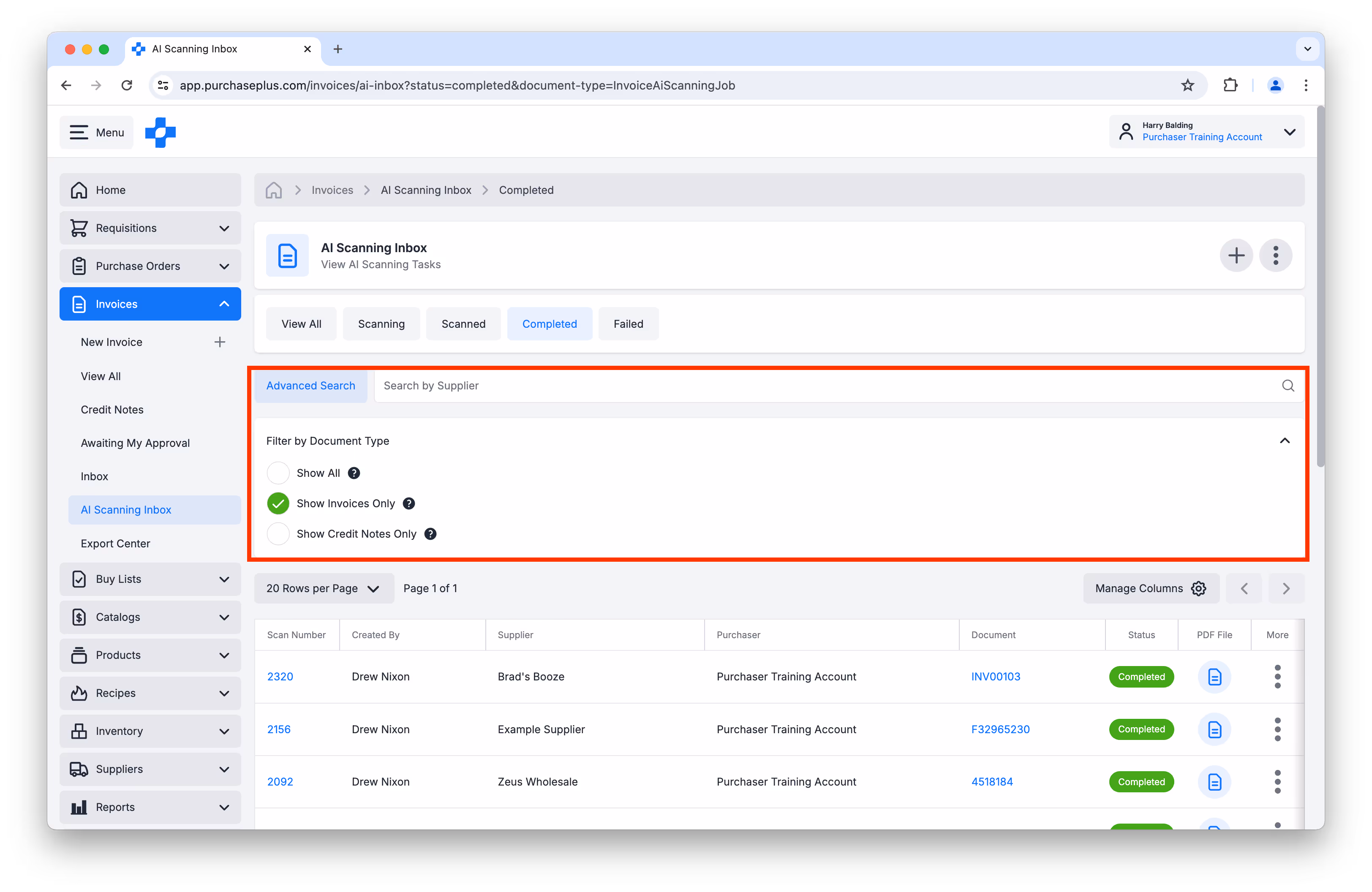Finally, you can now advanced search the AI Scanning Inbox by "Invoices Only" and "Credit Notes Only”: