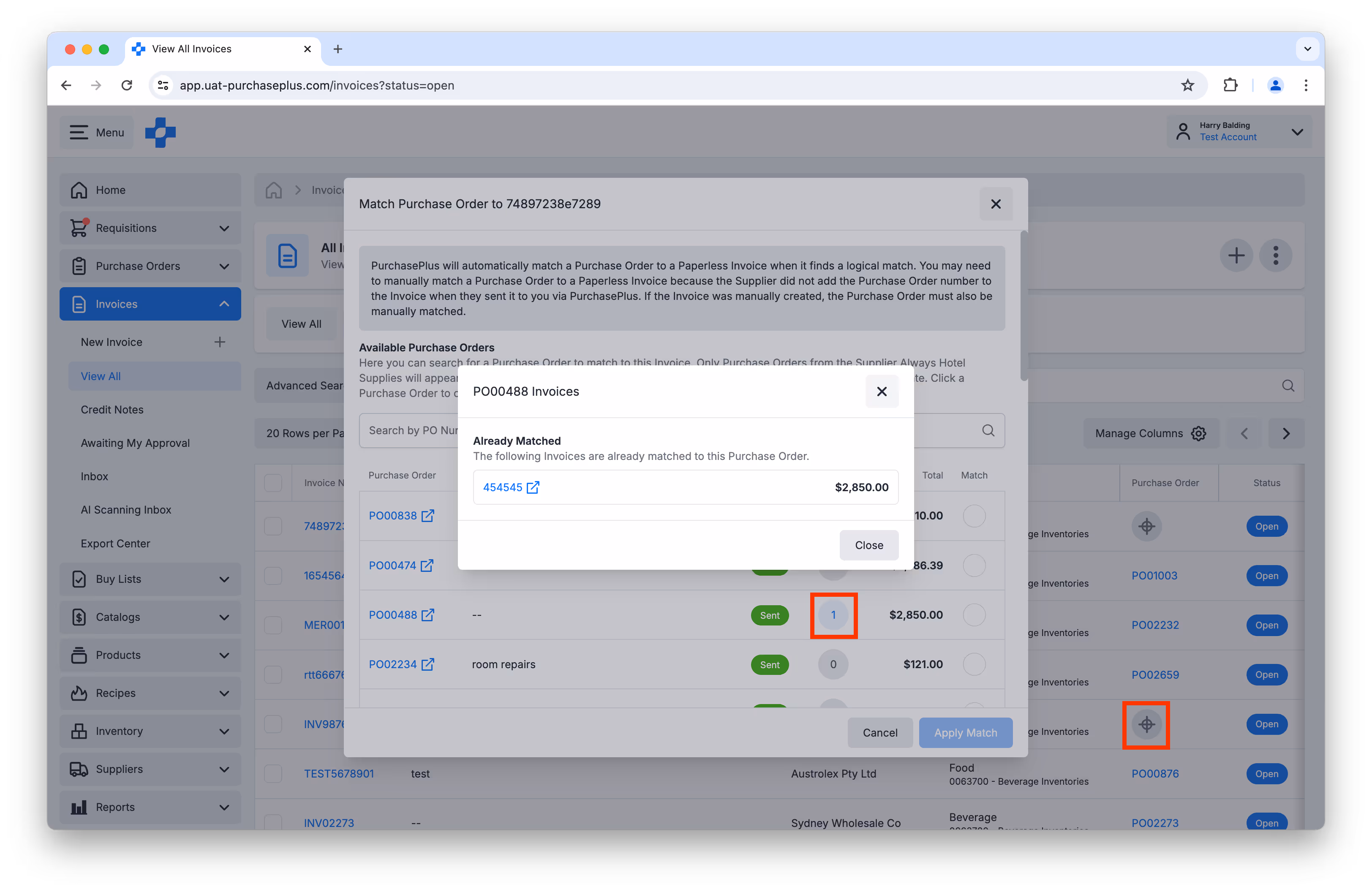 - We have improved the Match PO to Invoice Modal so that it shows a new column that is a count of the Invoices already matched to the PO: