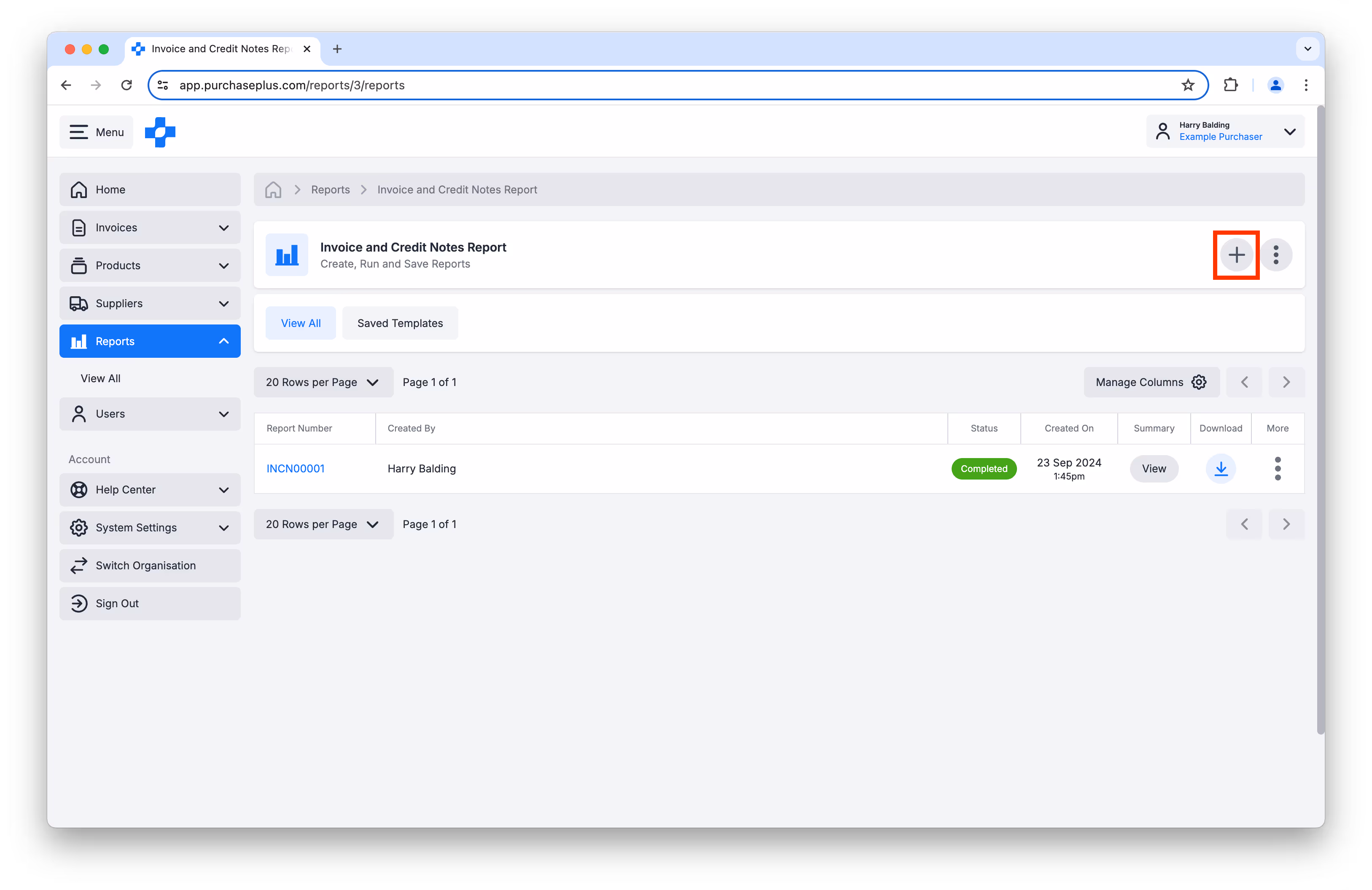 Then, click the [+] button in the top-right corner to create a new execution of this Report Type:
