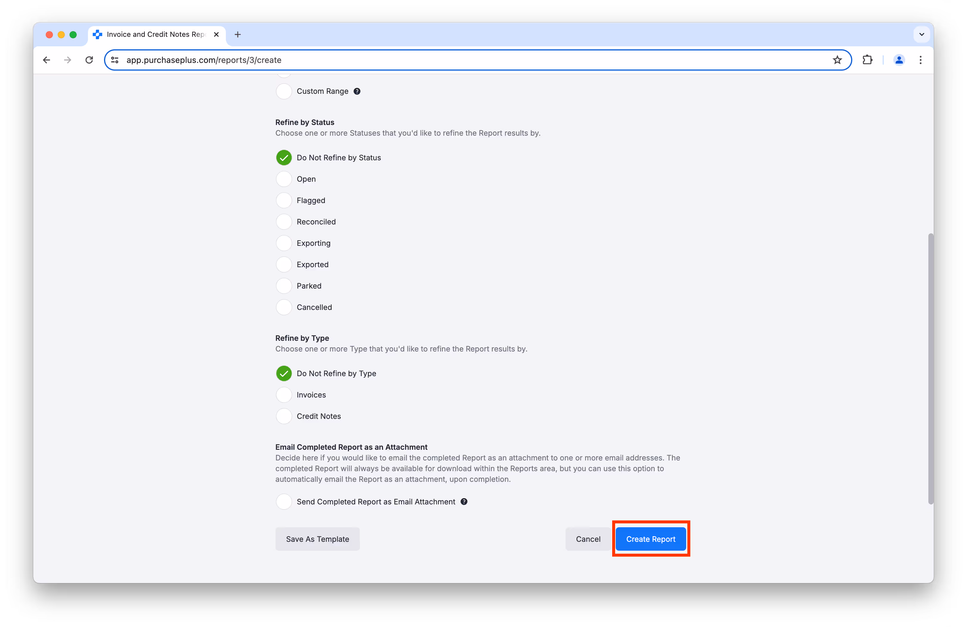 You will be able to define the Report execution's parameters (e.g. format, date range), and even elect to send the completed Report as an email to a specified email address. Once you have defined the parameters, click [Create Report] at the bottom of the page: