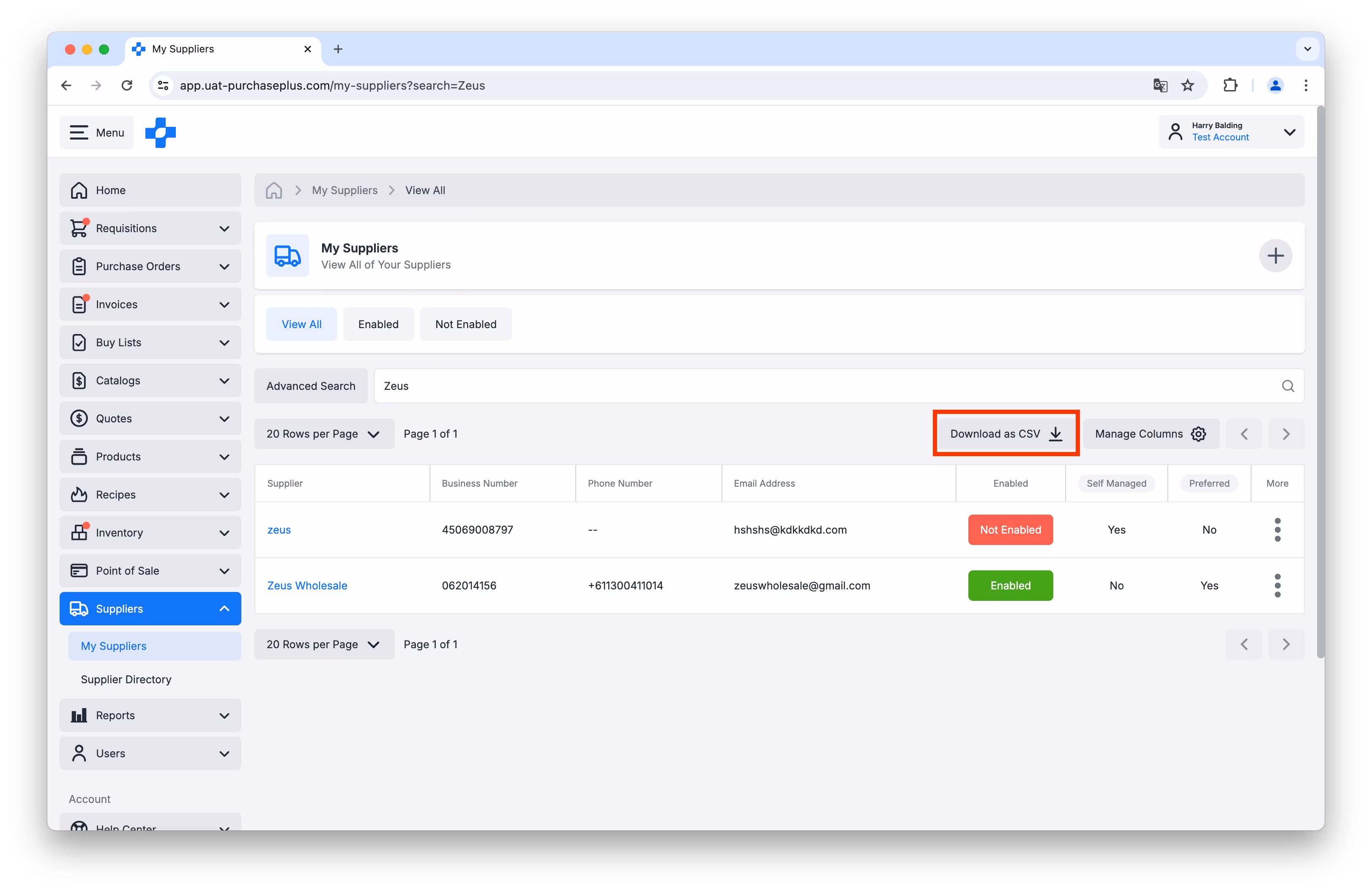[Download Current Page as CSV] button on the My Suppliers table view. This function is especially useful when you are using an Advanced Search filter (for example, Filter by Supplier Type or Preferred status). Importantly, only the Suppliers displayed in the currently-visible page of the table will be exported to CSV. We are planning on enhancing this further in the future.