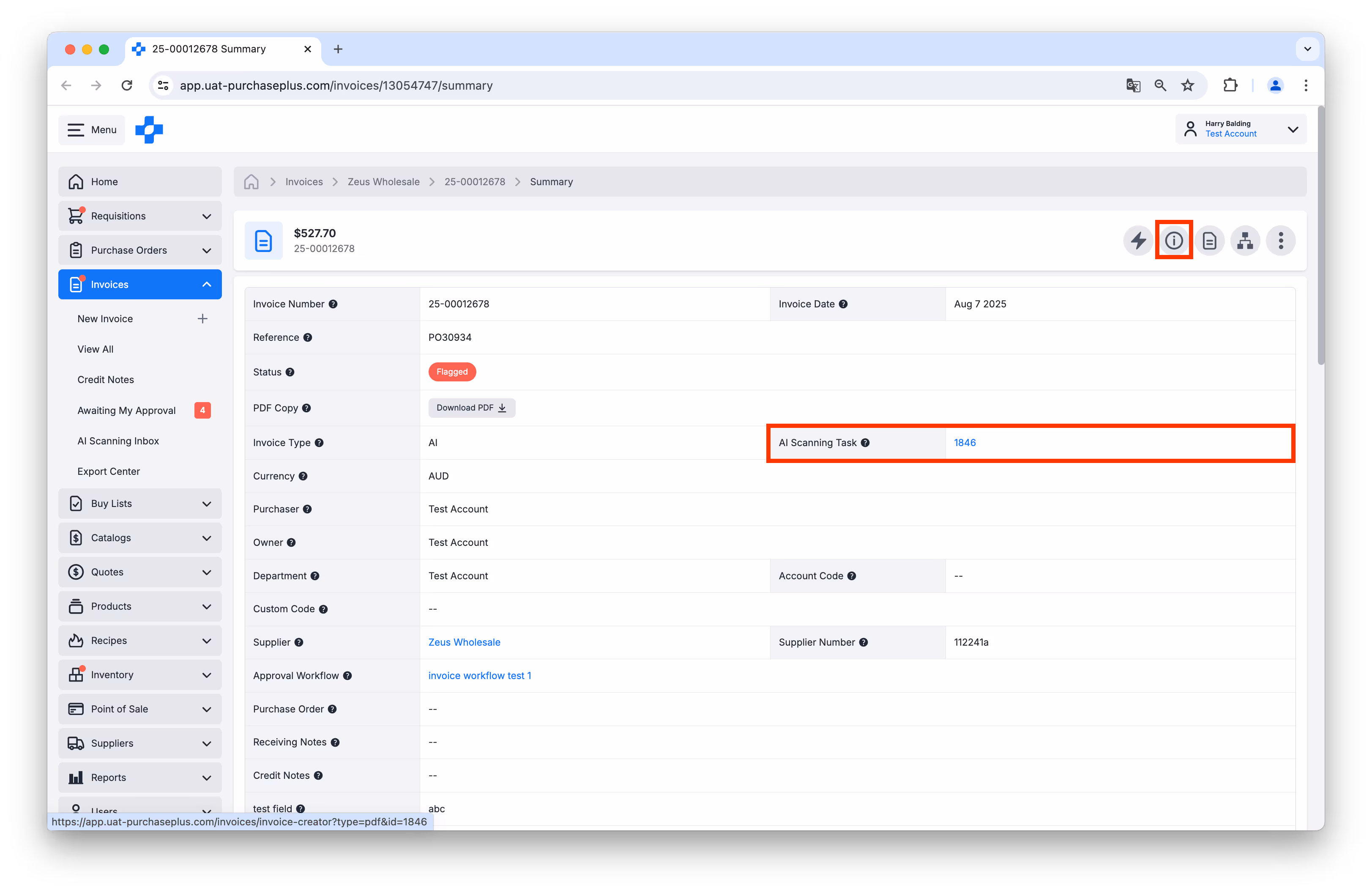 Above: The link for the AI Scanning Task from which the Invoice was generated.